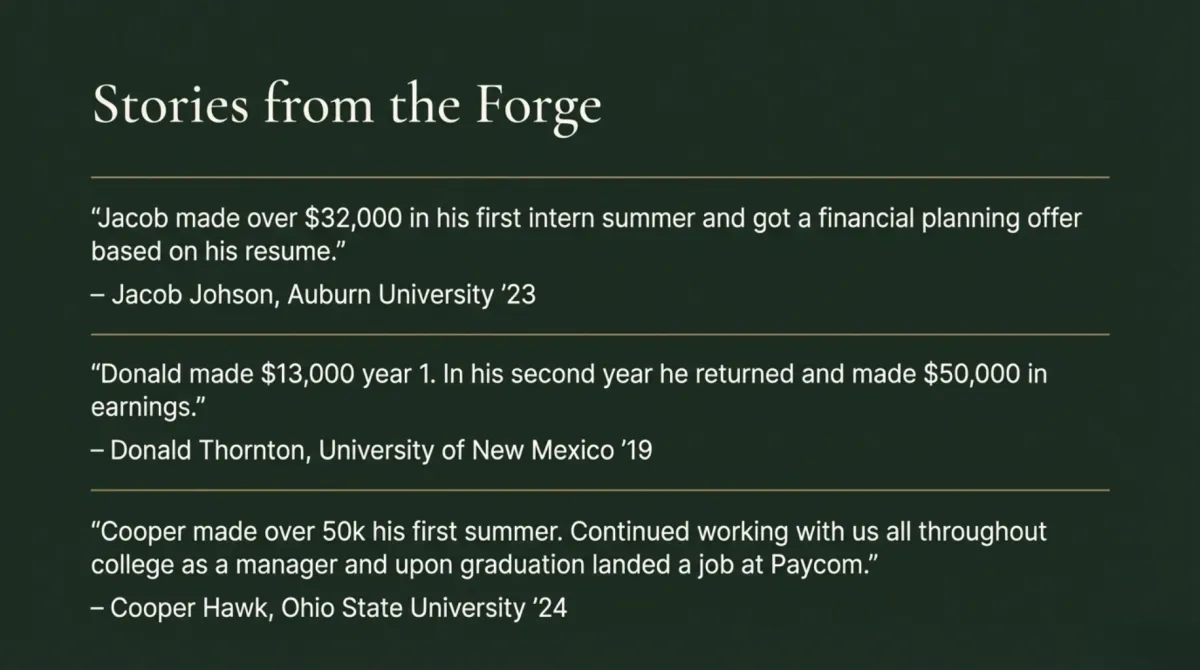 For families concerned about risk, the company offers a $10,000 earnings floor, as long as interns meet the attendance, effort, and training requirements outlined in the written agreement you’ll see before they commit. If they meet the requirements and still finish below $10,000 in commissions, the company makes up the difference to $10,000